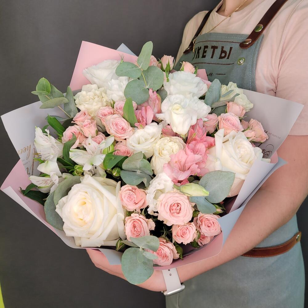 роза канделайт – 3 шт.Роза Мондиаль – 2 шт.Диантус – 4 шт.Альстромерия – 4 шт.Роза кустовая – 3 шт.эвкалипт ветка большая – 2 шт.Упаковка дизайнерская – 2 шт.