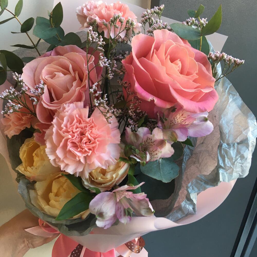 Роза – 2 шт.Гвоздика – 3 шт.Альстромерия – 1 шт.Роза кустовая – 1 шт.Лимониум – 1 шт.Упаковка дизайнерская – 1 шт.