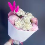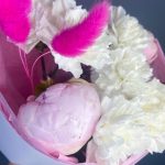 Гвоздика белая – 6 шт.Пион розовый – 3 шт.Лагурус (сухоцвет) – 3 шт.