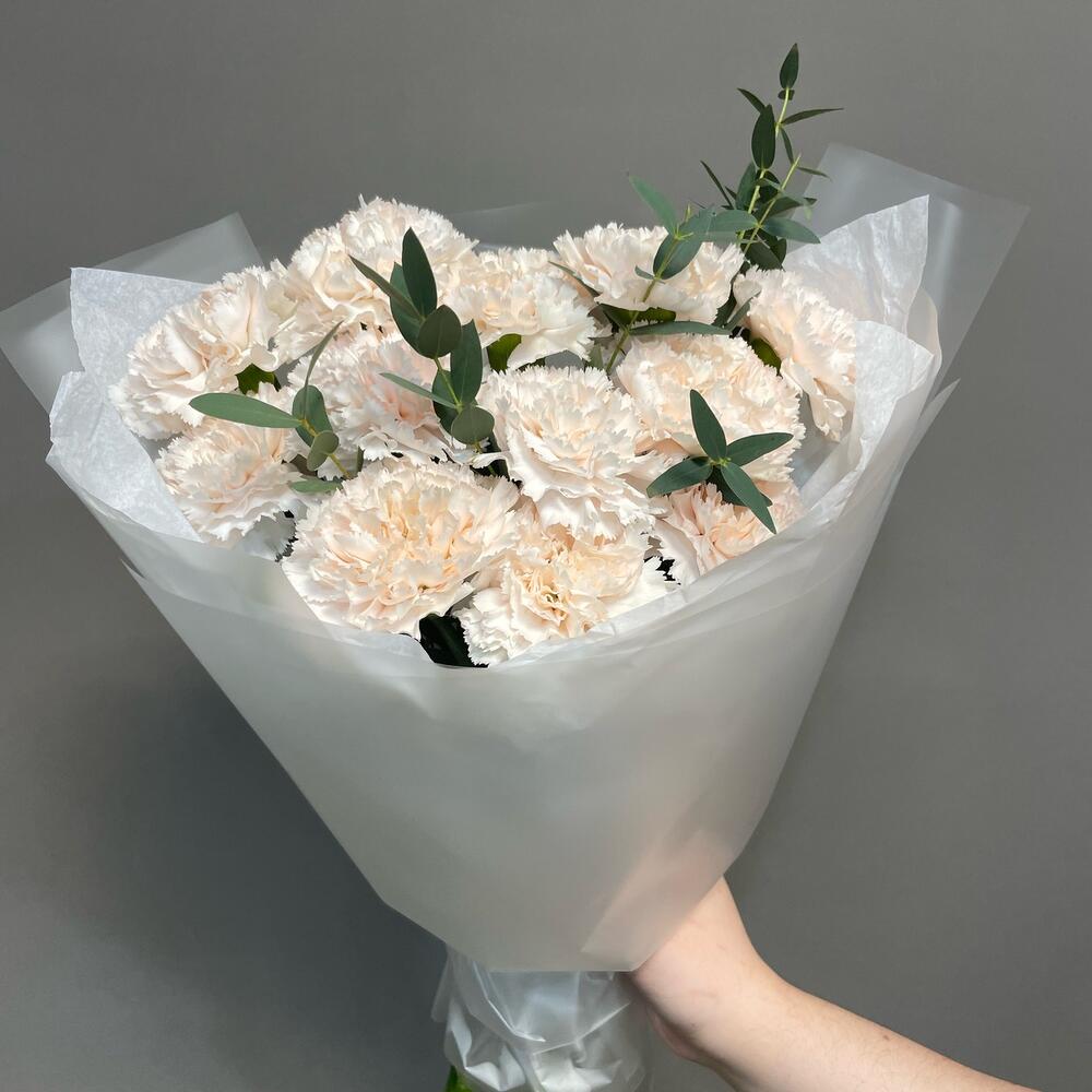 Гвоздика сортовая – 11 шт.Эвкалипт – 2 шт.Упаковка дизайнерская – 2 шт.Лента атласная – 2 шт.