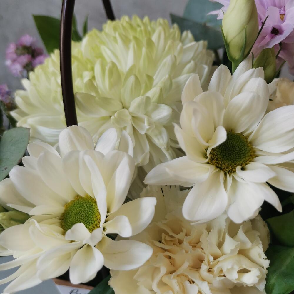 Хризантема – 1 шт.Хризантема кустовая – 1 шт.Сантини – 1 шт.Диантус – 3 шт.Эвкалипт – 3 шт.Оазис флористический – 1 шт.Сумка – 1 шт.