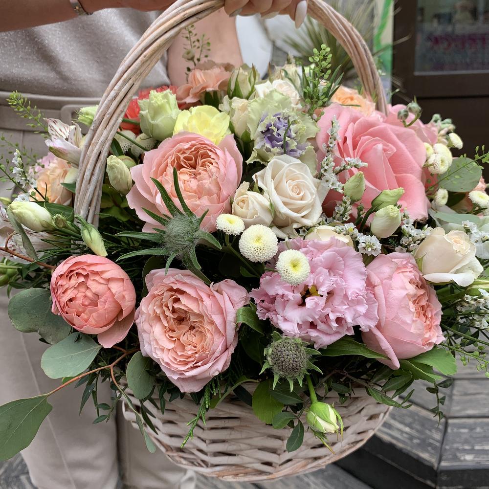 Альстромерия – 3 шт.Лизиантус – 1 шт.Маттиола – 1 шт.Роза – 4 шт.Матрикария – 1 шт.Фисташка – 4 шт.Роза кустовая пионовидная – 4 шт.Корзина плетеная – 1 шт.Гвоздика одноголовая – 4 шт.