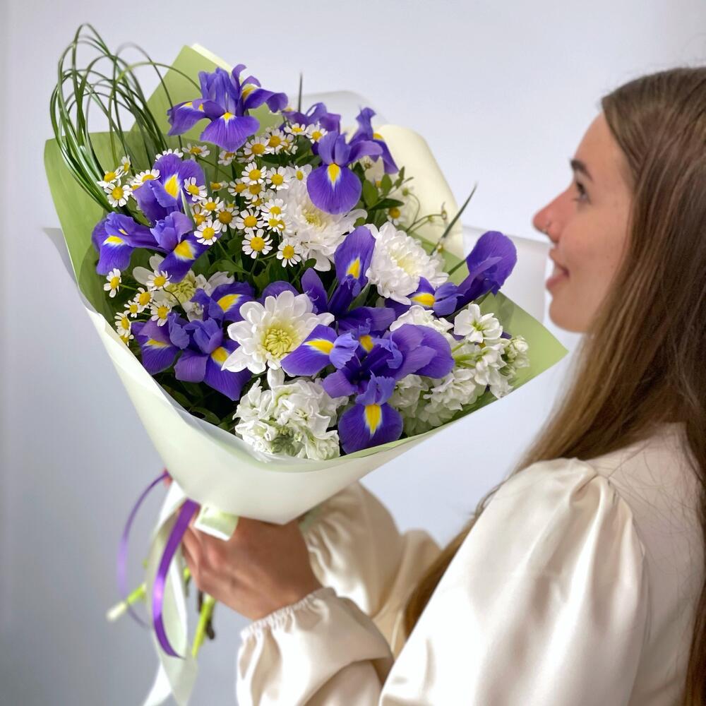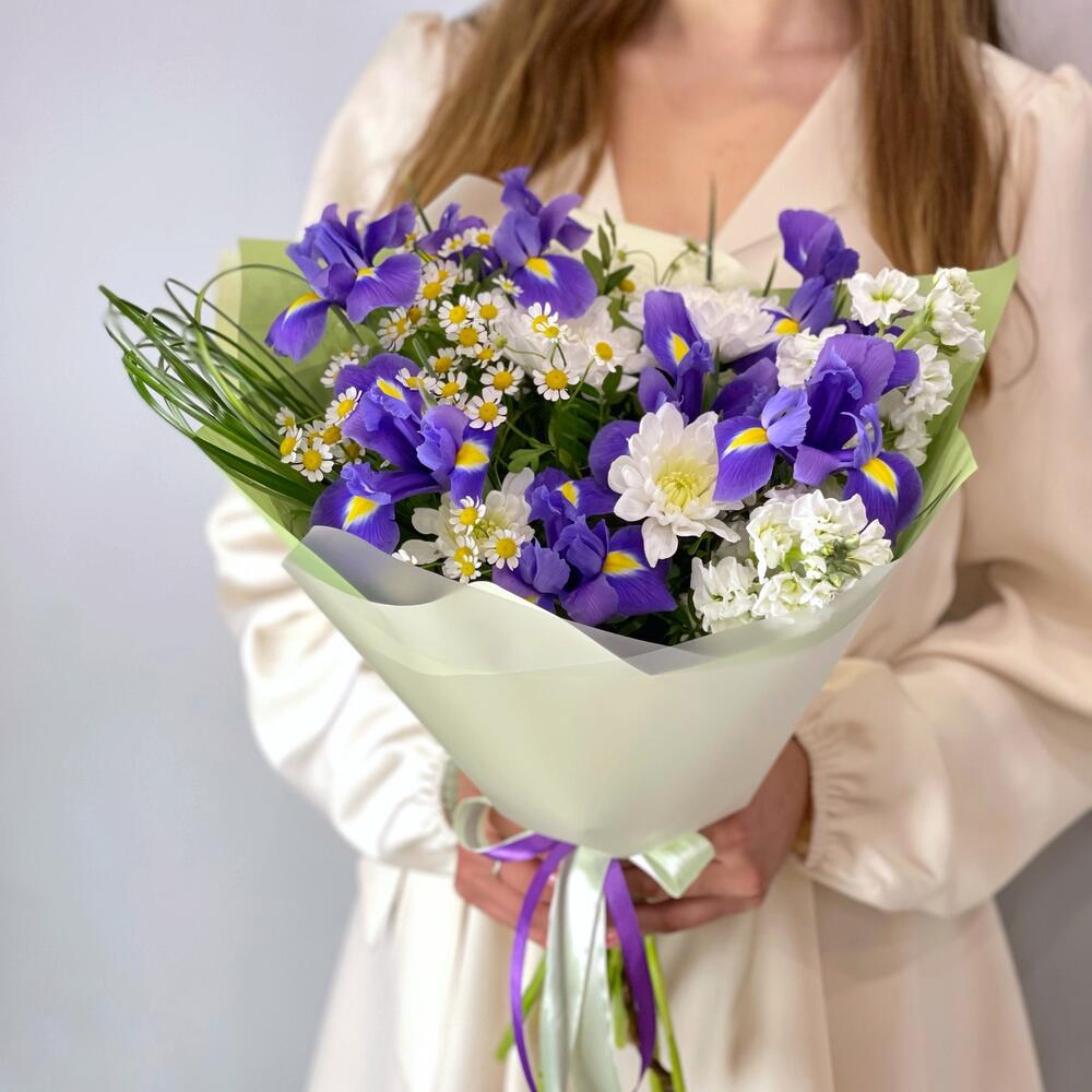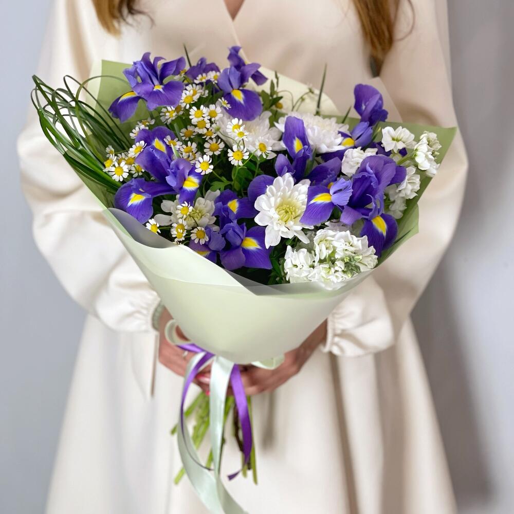 Маттиола – 2 шт.Хризантема кустовая – 1 шт.Матрикария – 1 шт.Фисташка – 2 шт.Упаковка дизайнерская – 1 шт.Берграсс пучок – 1 шт.ирисы – 7 шт.