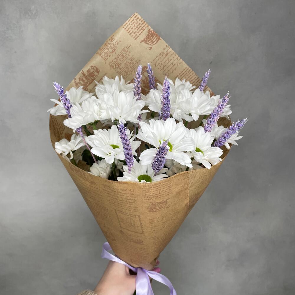 «Лавандовое созвездие» Букет из розы, гвоздики, статица и хлопка