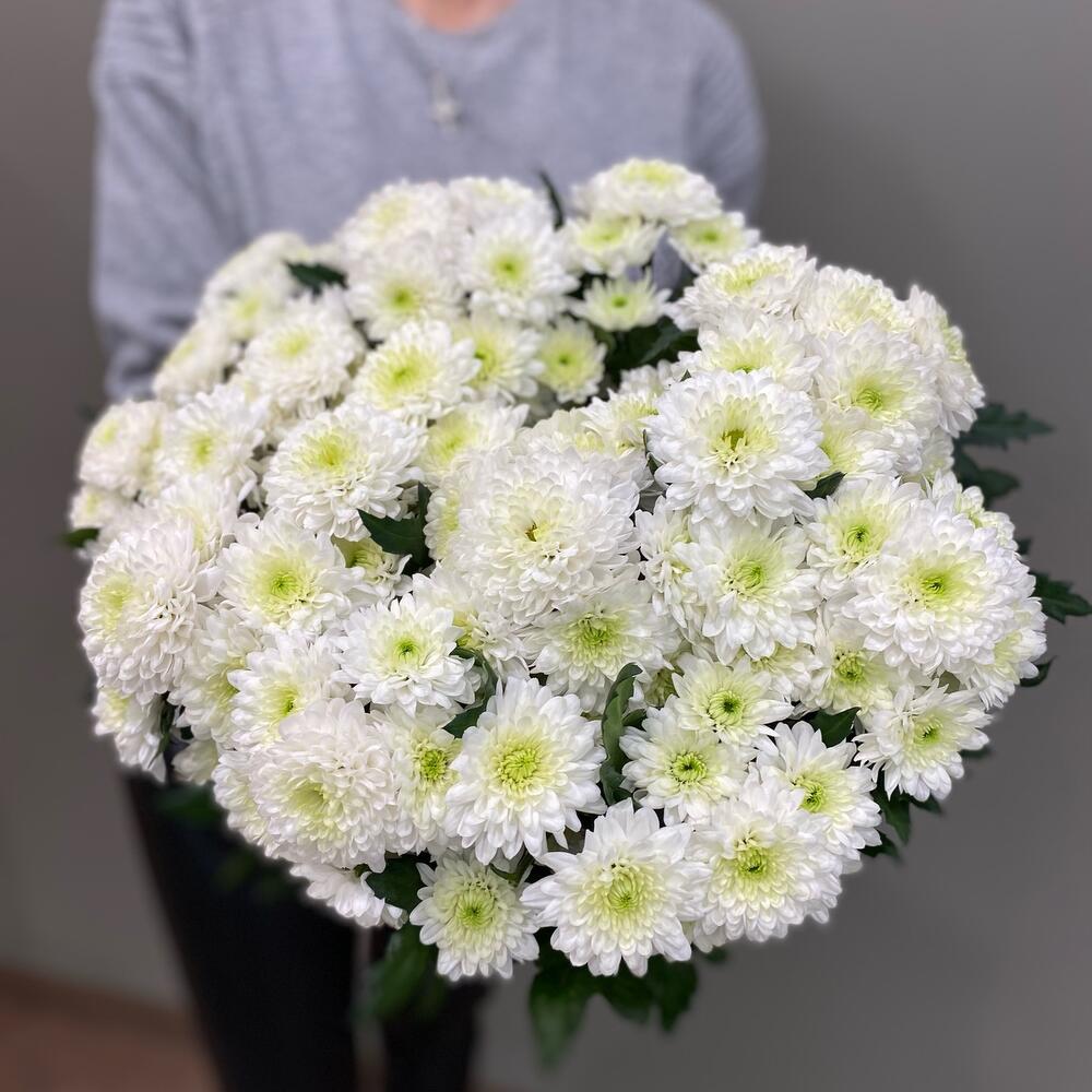 Хризантема кустовая – 13 шт.Пленка прозрачная – 1 шт.Лента атласная – 1 шт.