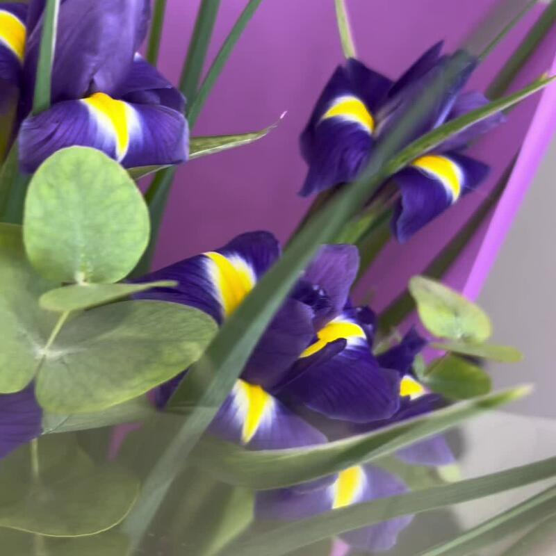 Ирис – 5 шт.Эвкалипт – 1 шт.Лента атласная – 1 шт.Упаковка дизайнерская – 2 шт.