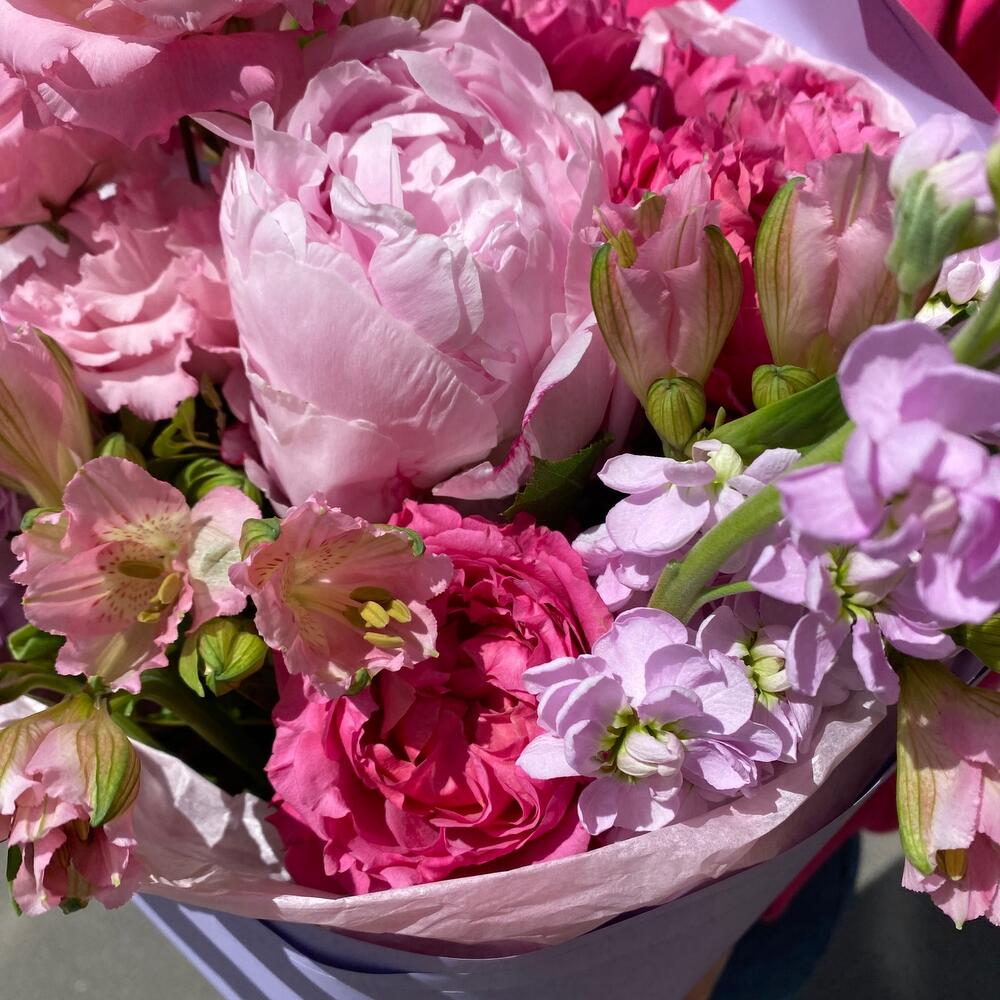 Альстромерия – 2 шт.Лизиантус – 1 шт.Маттиола – 3 шт.Пион – 1 шт.Роза пионовидная кустовая – 2 шт.Фисташка – 3 шт.Упаковка дизайнерская – 1 шт.