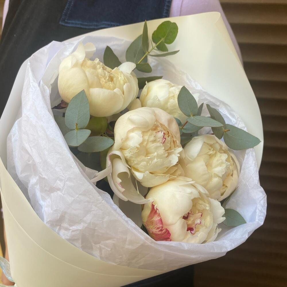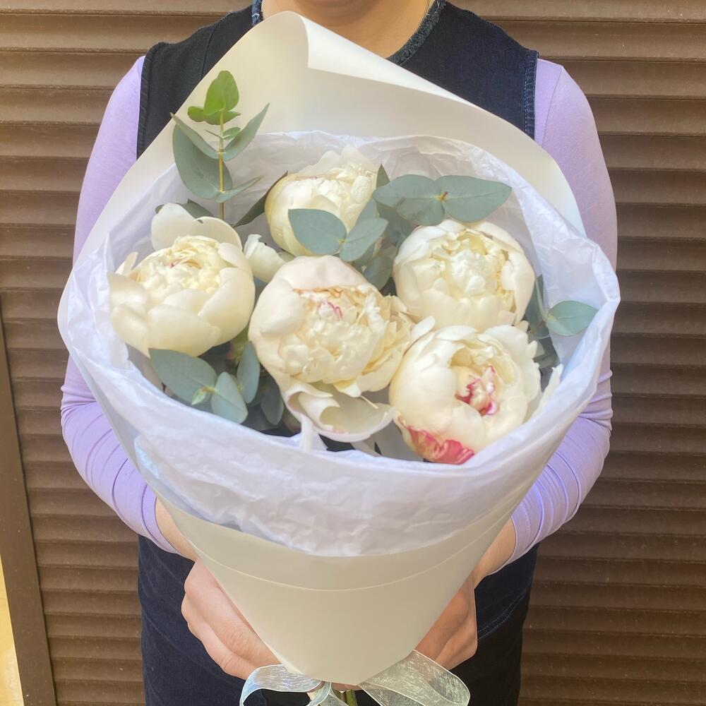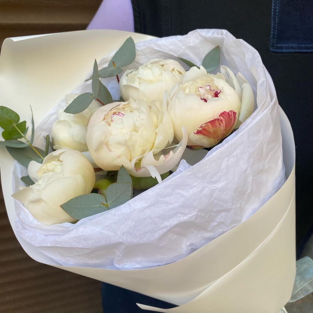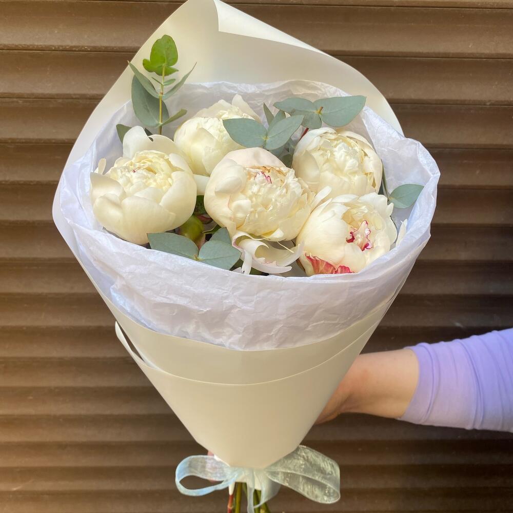Эвкалипт – 5 шт.Лента атласная – 1 шт.Пион белый – 5 шт.Тишью белое – 1 шт.Пленка дизайнерская – 1 шт.