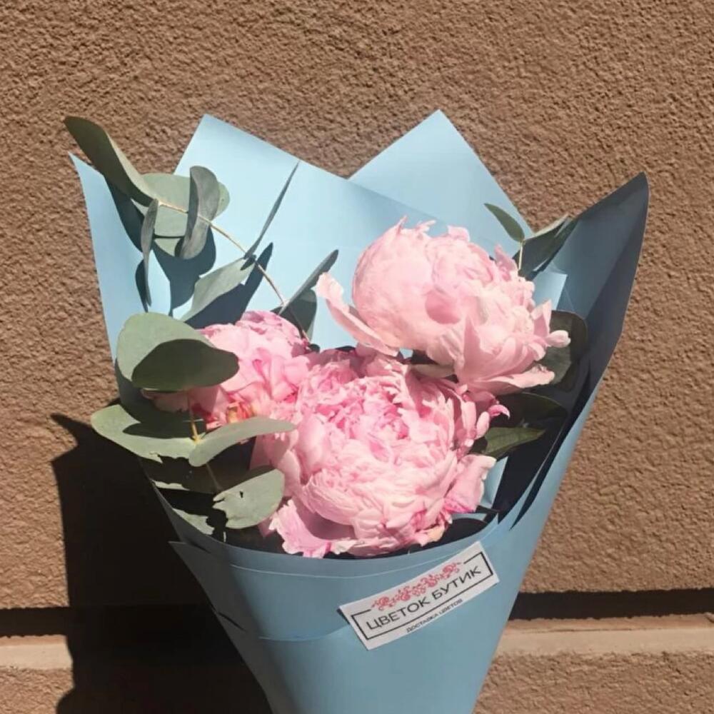 Атласная лента – 1 шт.Пион Сара Бернар – 3 шт.Эвкалипт цинерея – 3 шт.Матовая пленка – 1 шт.