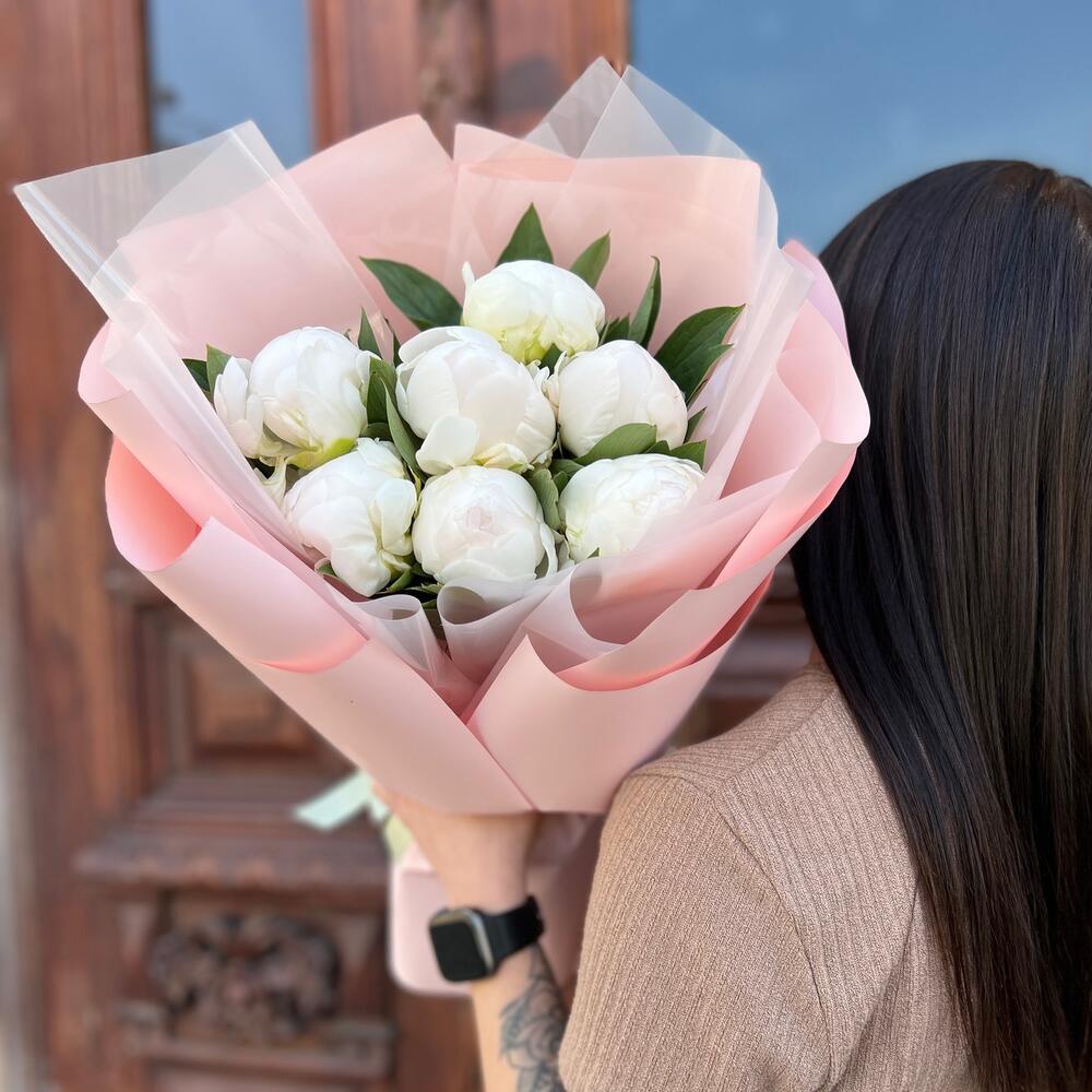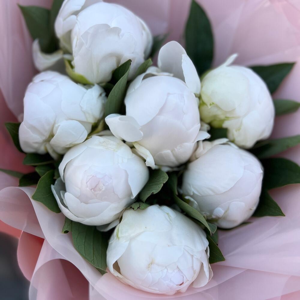 Лента атласная – 2 шт.Пленка матовая – 5 шт.пион мадам клод тейн – 7 шт.пленка полупрозрачная – 4 шт.
