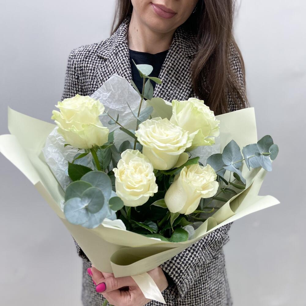 5 кремовых роз и эвкалипт