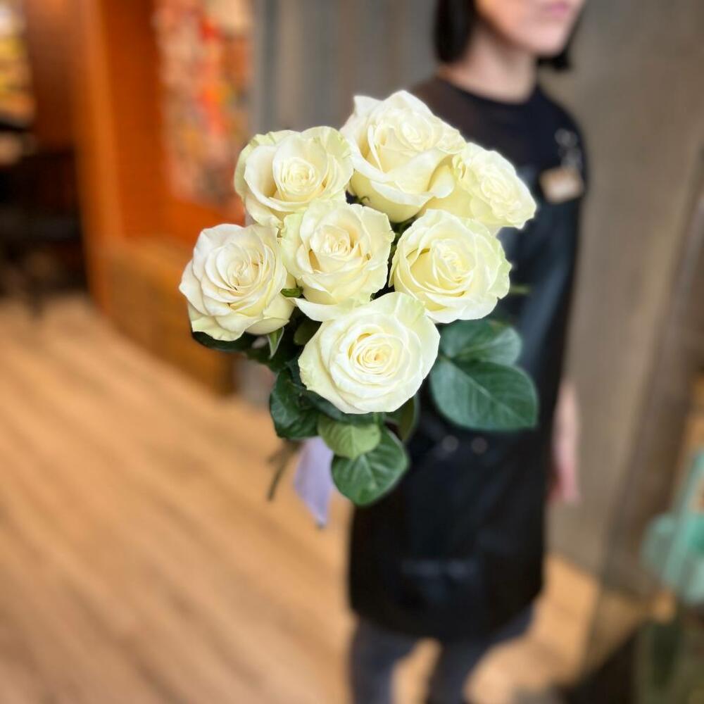 белые розы эквадор 50 см – 7 шт.Лента атласная – 2 шт.