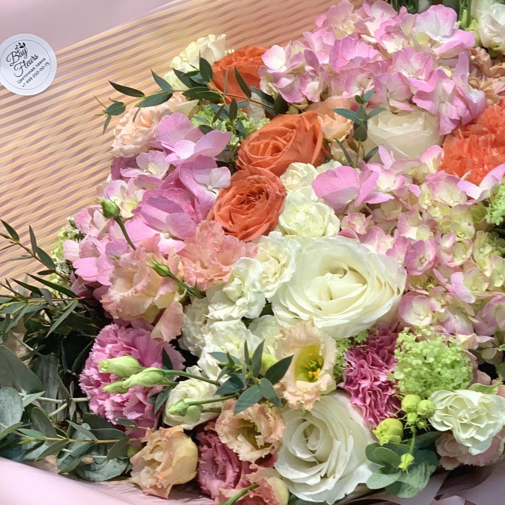 Роза пионовидная садовая – 5 шт.Гортензия – 2 шт.Роза кустовая пионовидная – 5 шт.Лизиантус алиса пинк – 3 шт.Гвоздика – 7 шт.Роза – 6 шт.Вибурнум – 3 шт.Эвкалипт – 3 шт.Упаковка дизайнерская – 1 шт.Лента атласная – 1 шт.