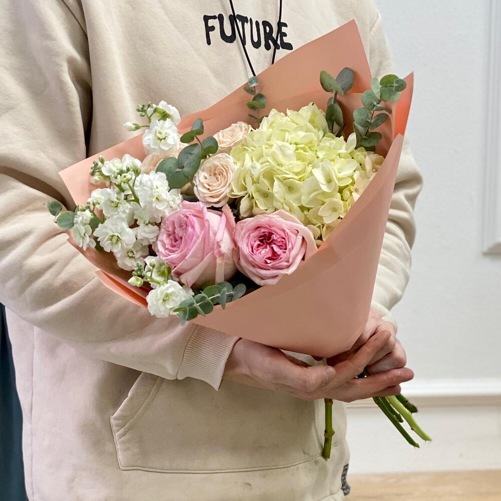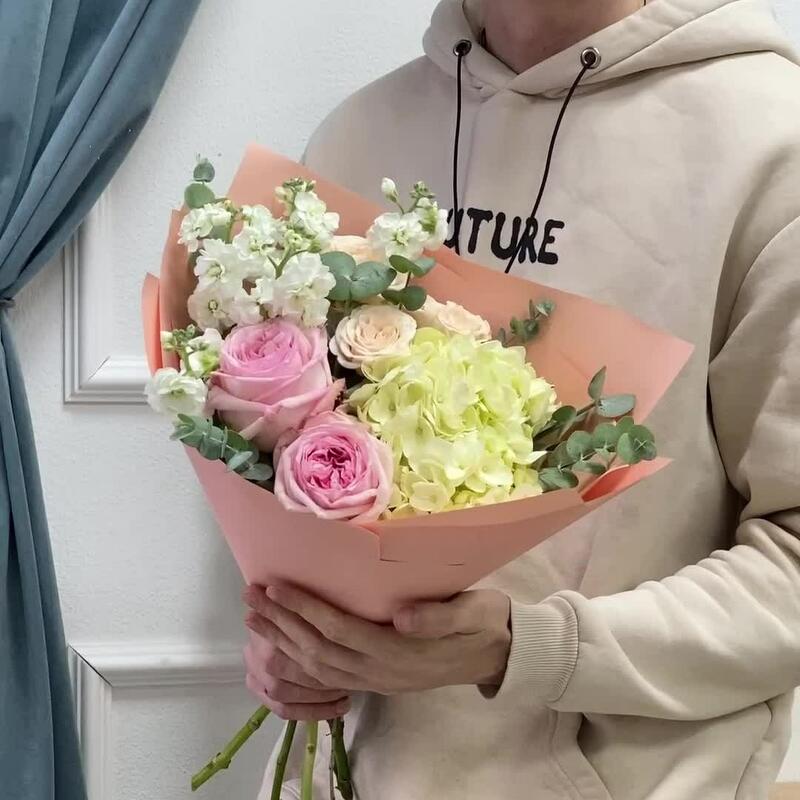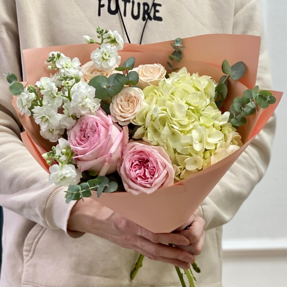 Гортензия – 1 шт.Эвкалипт – 2 шт.Роза кустовая бежевая – 1 шт.Пленка матовая – 1 шт.маттиола кустовая белая – 1 шт.роза пинк охара(ароматная) – 2 шт.