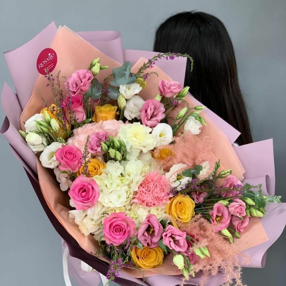 Альстромерии, Гвоздики, Кустовые розы, Лизиантусы, Розы, Хризантемы