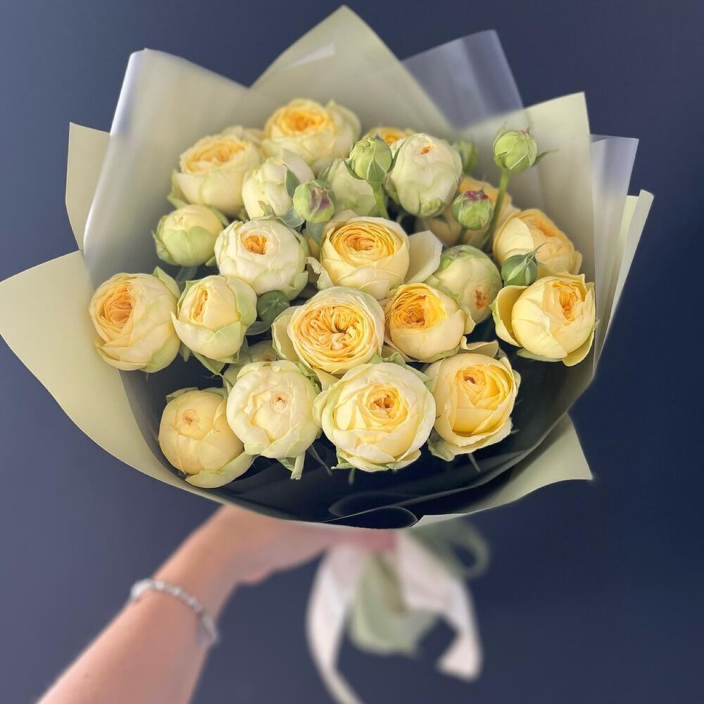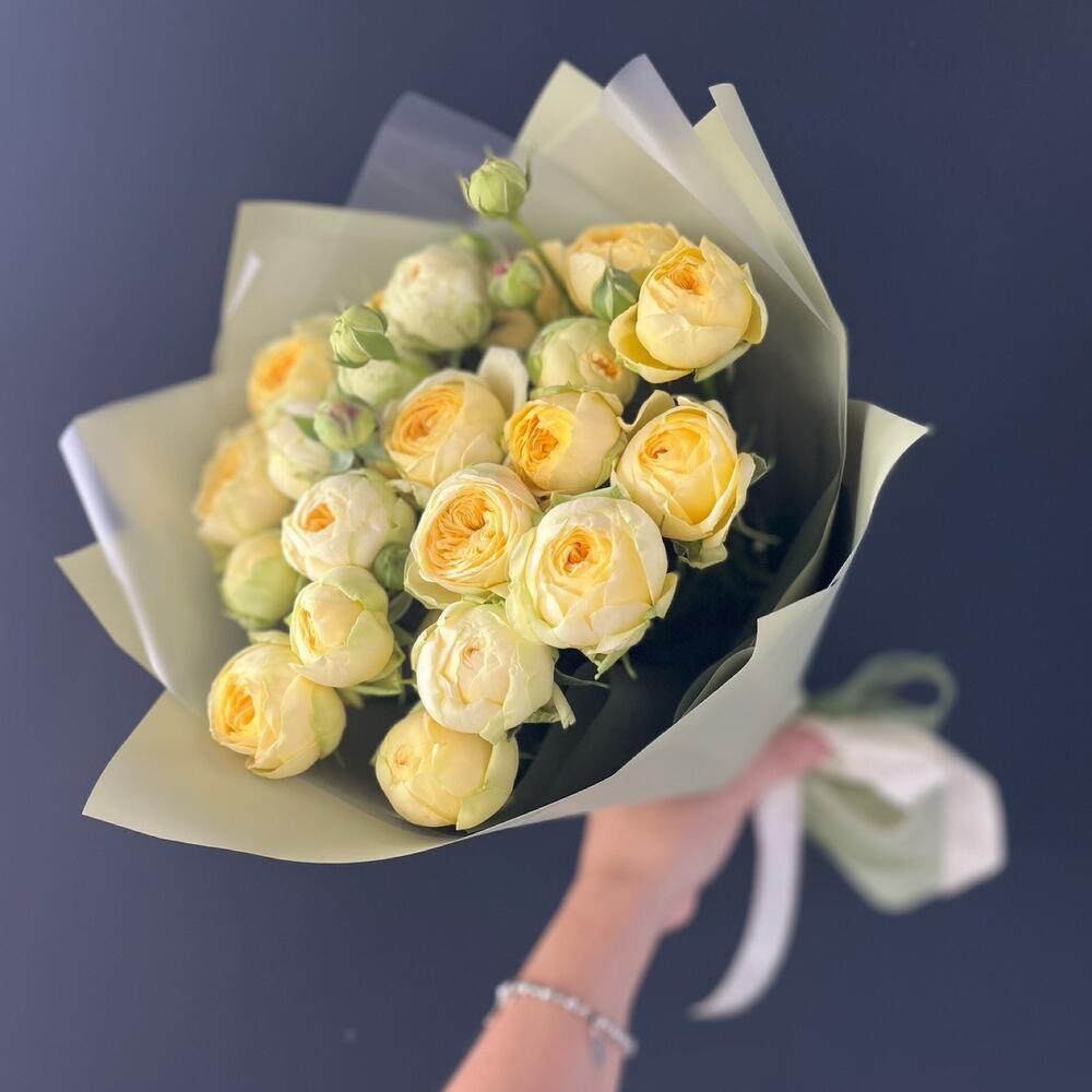 желтые пионовидные кустовые розы 60 см в дизайнерской упаковке – 7 шт. Дизайнерская упаковка – 1 шт. Открыточка с вашими пожеланиями – 1 шт. доставка – 1 шт.