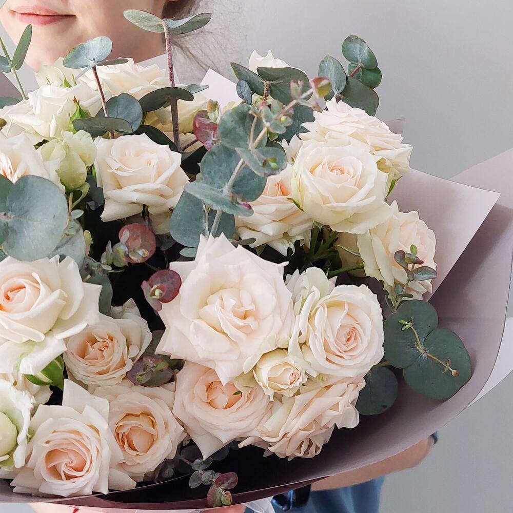 Роза кустовая – 9 шт.Упаковка дизайнерская – 2 шт.Лента органза – 1 шт.Открыточка с вашими пожеланиями – 1 шт.Эвкалипт Baby Blue – 3 шт.