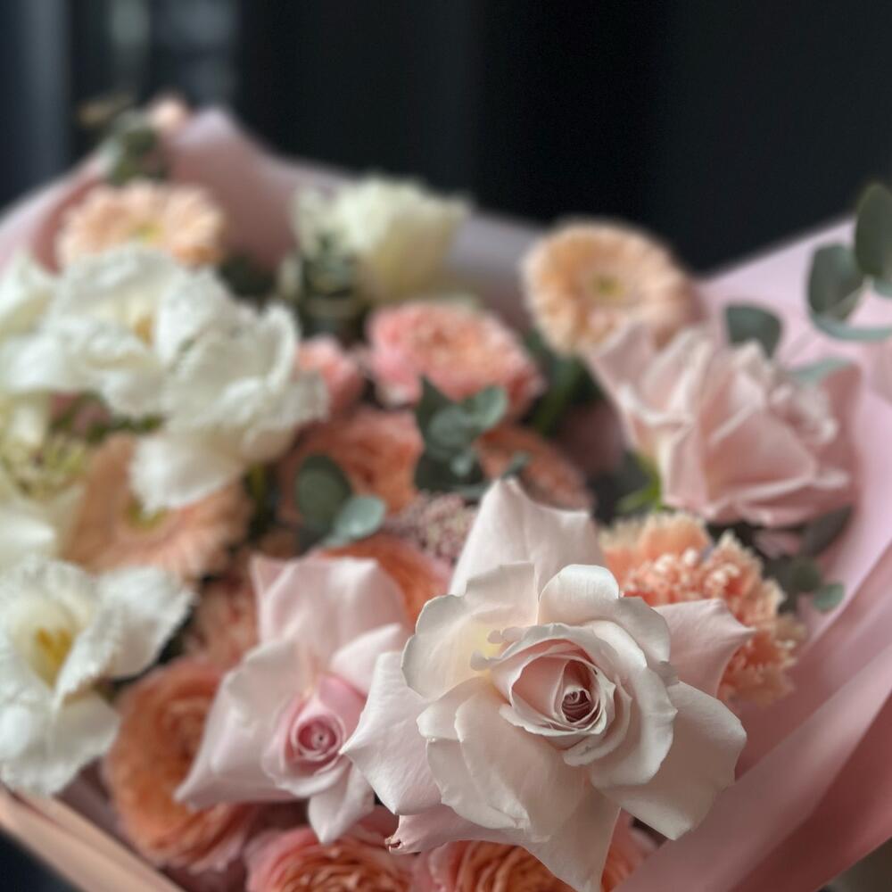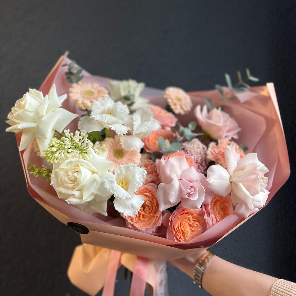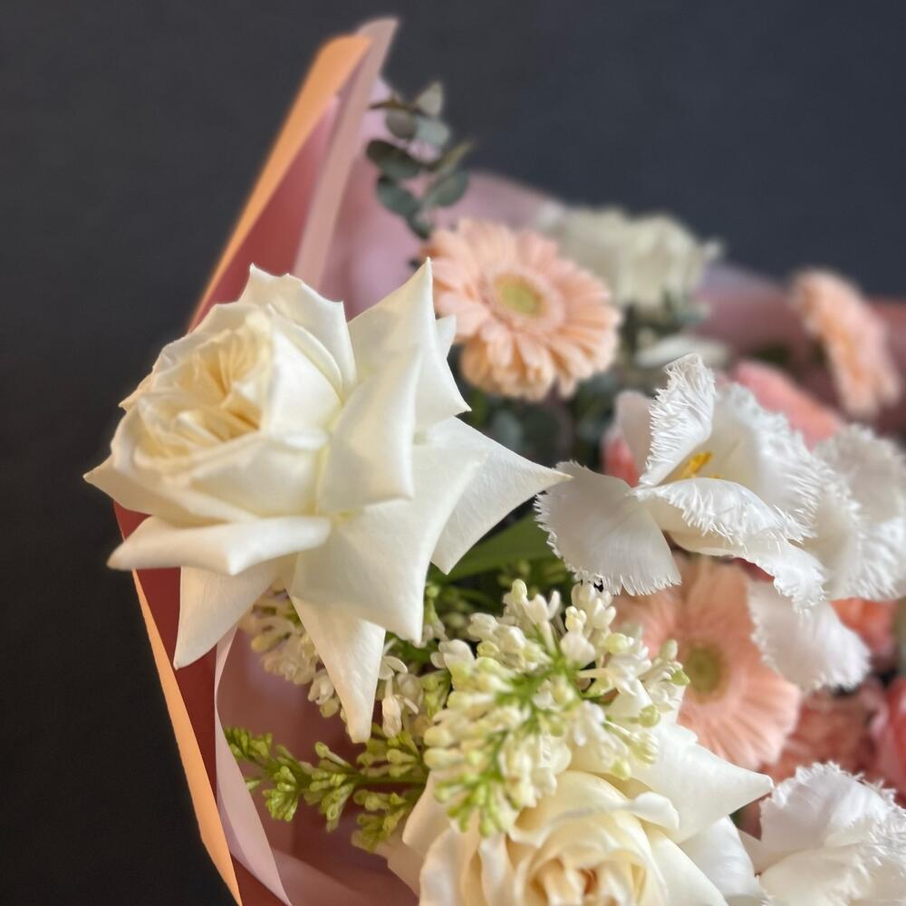 Кустовая пионовидная роза – 2 шт.Одноголовая роза – 6 шт.Гербера – 3 шт.Тюльпан – 3 шт.Озотамнус – 1 шт.Сирень – 1 шт.Эвкалипт – 3 шт.декоративная упаковка – 1 шт.Атласная лента – 1 шт.