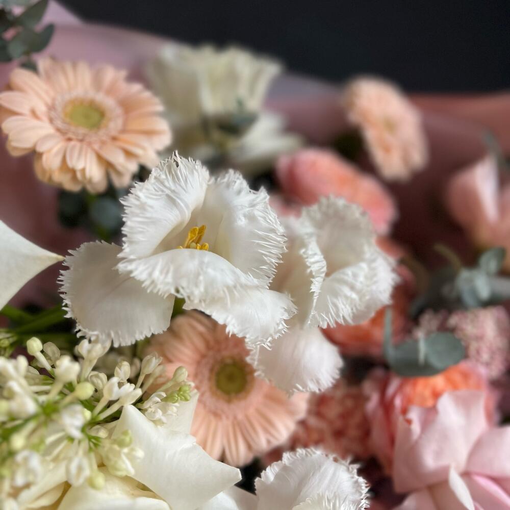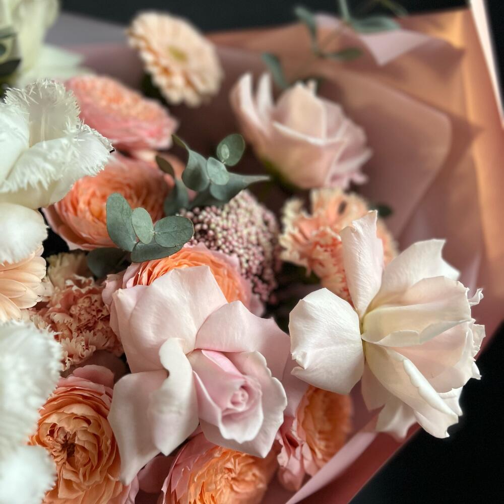 Кустовая пионовидная роза – 2 шт.Одноголовая роза – 6 шт.Гербера – 3 шт.Тюльпан – 3 шт.Озотамнус – 1 шт.Сирень – 1 шт.Эвкалипт – 3 шт.декоративная упаковка – 1 шт.Атласная лента – 1 шт.