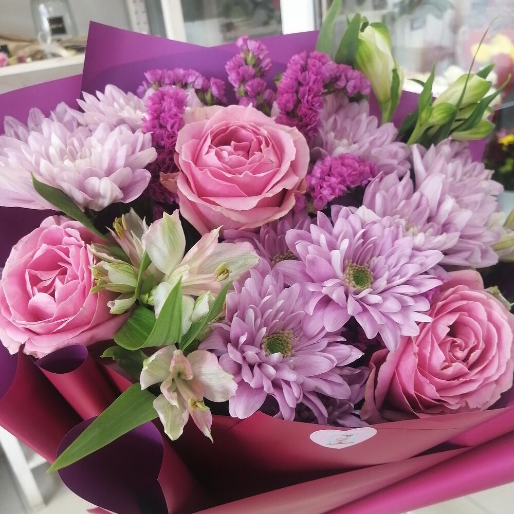 Альстромерия – 3 шт.Статица – 1 шт.Хризантема кустовая – 3 шт.Роза – 3 шт.Упаковка – 1 шт.