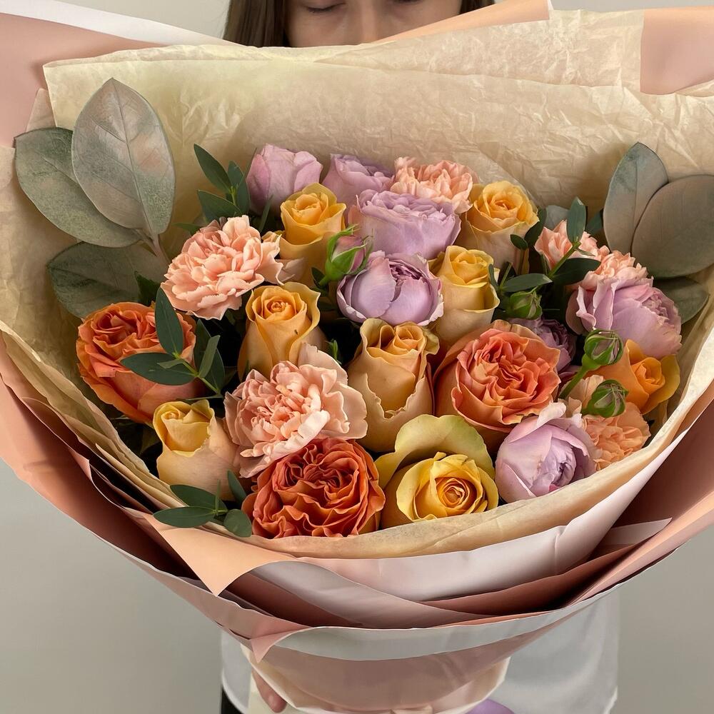Папоротник – 3 шт.Эвкалипт – 2 шт.Роза – 8 шт.Кустовая роза – 2 шт.Диантус – 5 шт.Оформление – 2 шт.