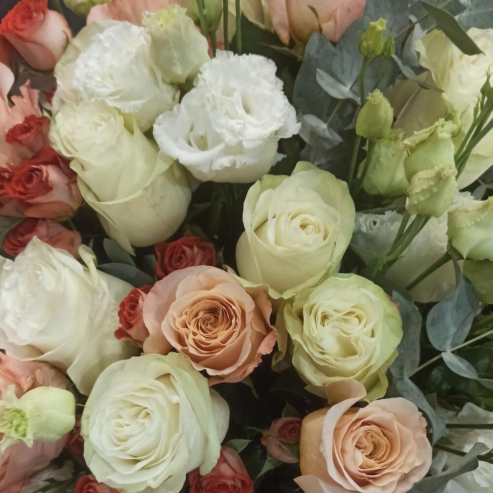 Роза Мондиаль – 25 шт.Лизиантус – 10 шт.Роза кустовая – 10 шт.Эвкалипт – 15 шт.Рускус – 20 шт.Пленка корейская – 4 шт.Лента атласная – 2 шт.Роза шиммер – 24 шт.