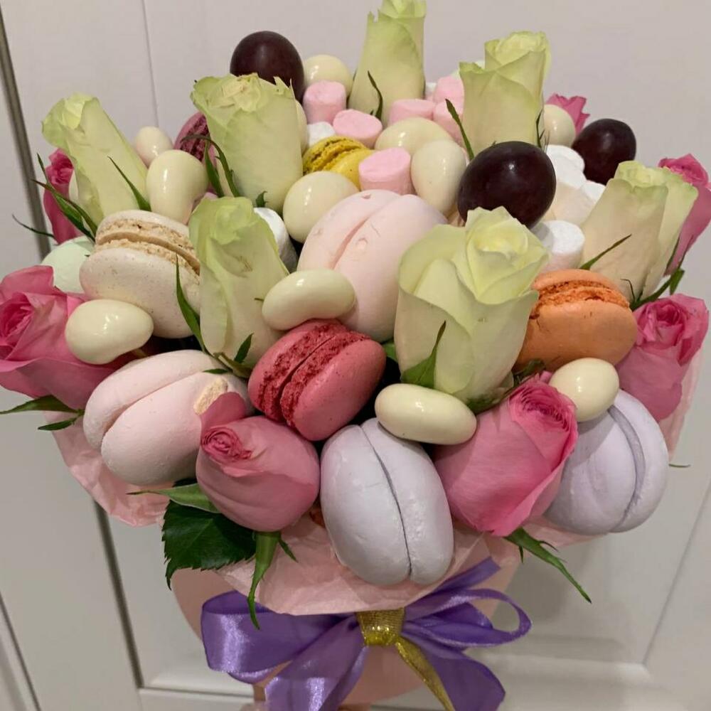 макарон (пирожное) – 6 шт.орехи в глазури – 100 гр.розы белые россия – 9 шт.розы розовые – 9 шт.зефир цветной – 200 гр.мешмеллоу – 100 гр.