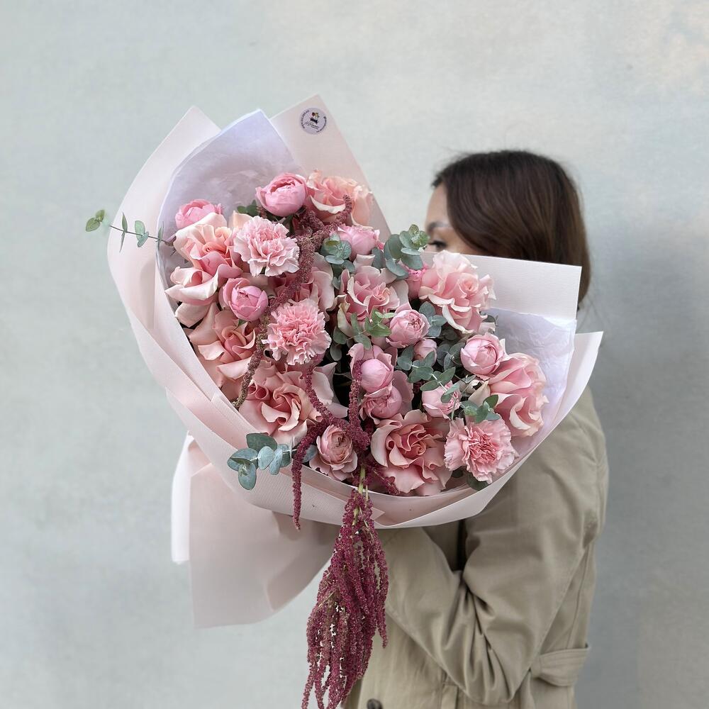 Альстромерии, Гвоздики, Кустовые розы, Лизиантусы, Розы, Хризантемы