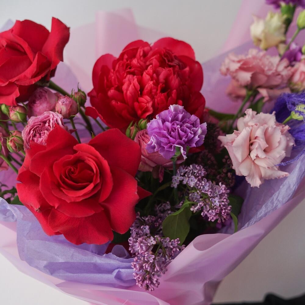 Пион – 1 шт.Роза французская – 2 шт.Роза кустовая – 2 шт.пампасная трава – 2 шт.Диантус – 4 шт.лизаантус – 2 шт.Сирень – 1 шт.Упаковка дизайнерская – 1 шт.