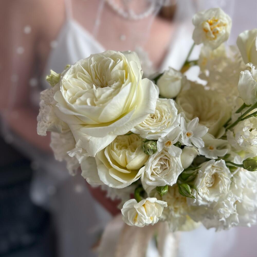 Лизиантус – 3 шт.Нарцисс – 9 шт.Диантус – 5 шт.Пионовидная роза – 5 шт.Атласная лента – 1 шт.Кустовая пионовидная роза – 5 шт.пальмовое копье – 1 шт.