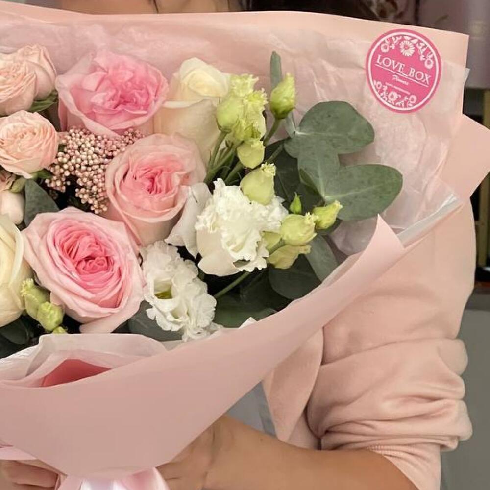 Пионовидная роза – 3 шт.Роза Эквадор – 2 шт.Кустовая роза – 2 шт.Эустома – 1 шт.Озотамнус – 1 шт.Эвкалипт – 4 шт.Авторская упаковка – 3 шт.