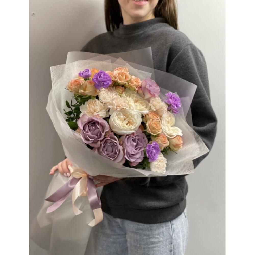Гвоздики, Лизиантусы, Розы, Тюльпаны