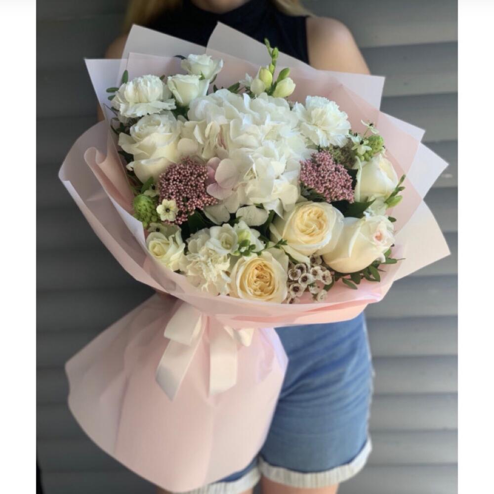 Альстромерии, Гортензии, Кустовые розы, Лизиантусы, Розы, Хризантемы