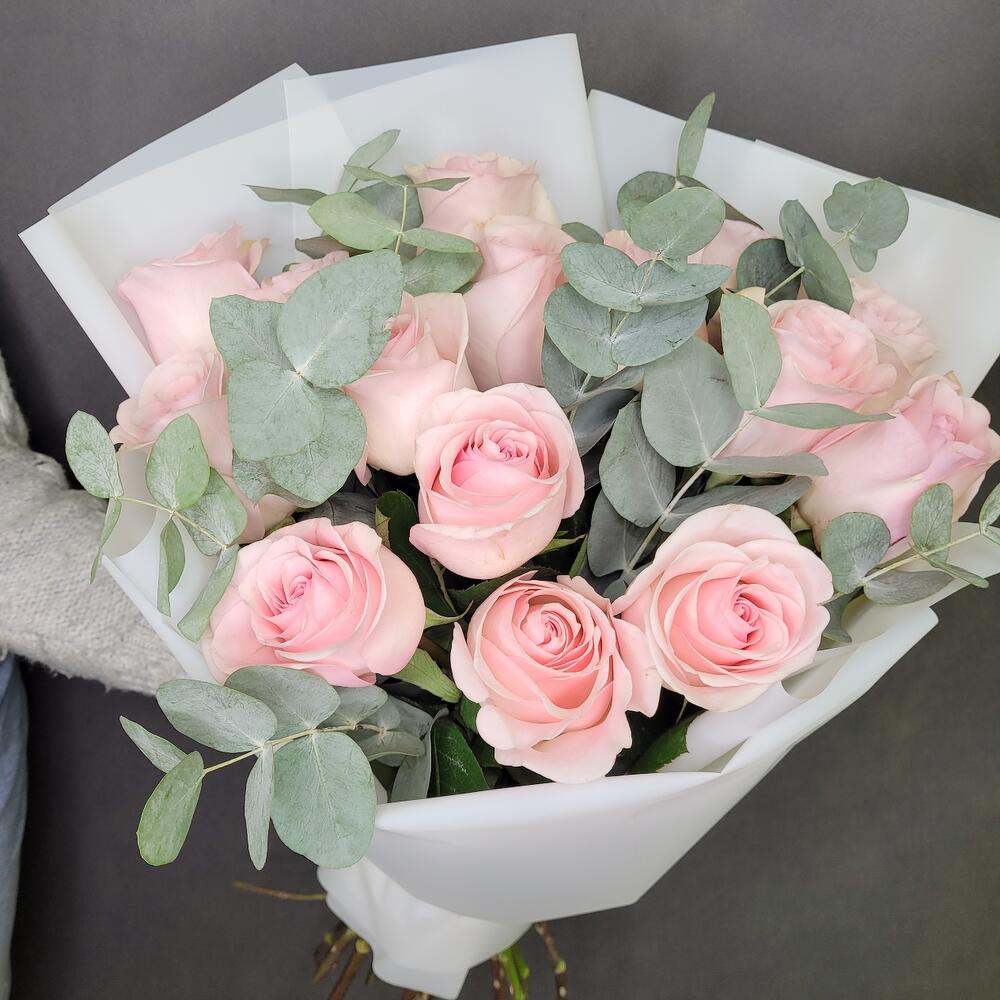 Букет розовых Роз и Эвкалипта
