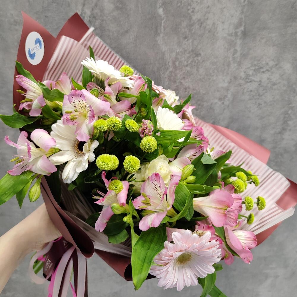 Альстромерия – 7 шт.Гербера – 6 шт.Роза – 3 шт.хризантема кустовая помпон – 3 шт.Авторская упаковка – 1 шт.Атласная лента – 1 шт.