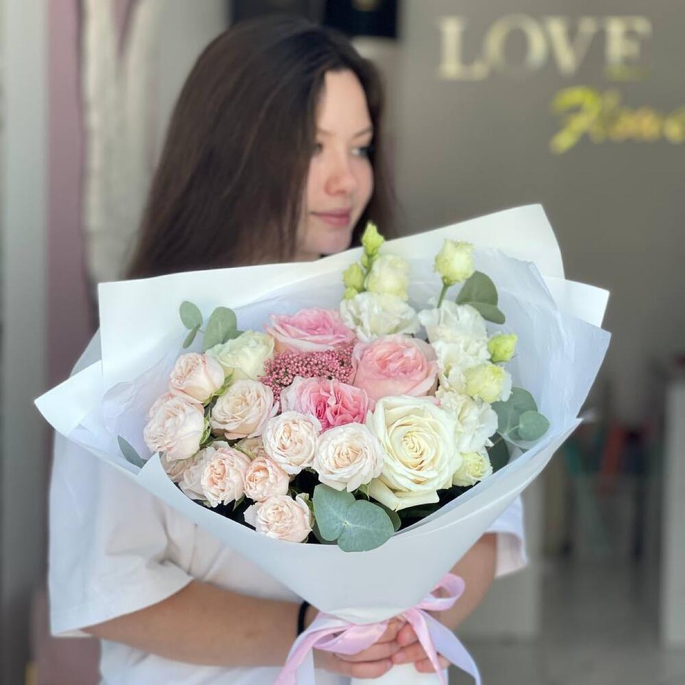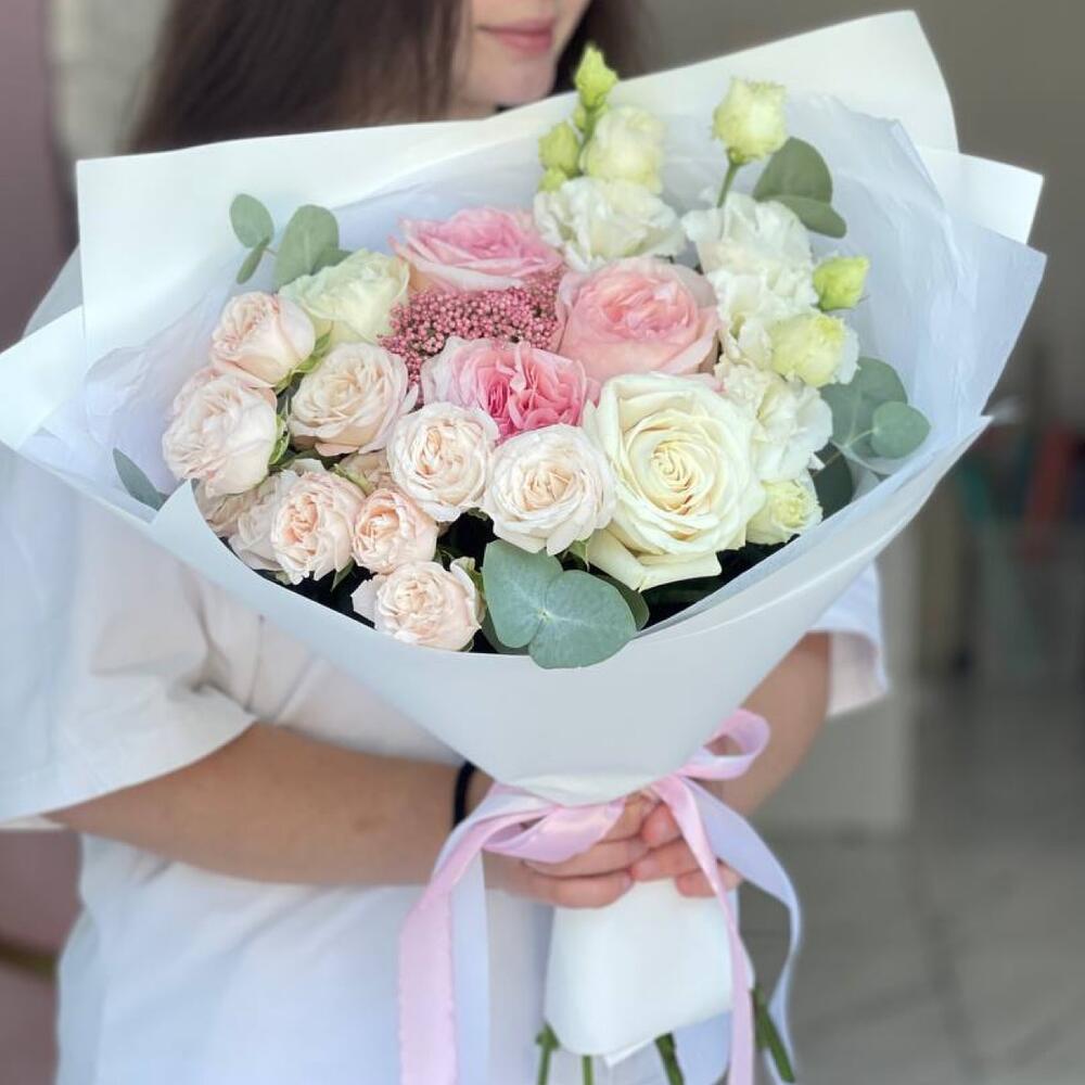 Пионовидная роза – 3 шт.Роза Эквадор – 2 шт.Кустовая роза – 2 шт.Озотамнус – 1 шт.Эустома – 2 шт.Эвкалипт – 3 шт.