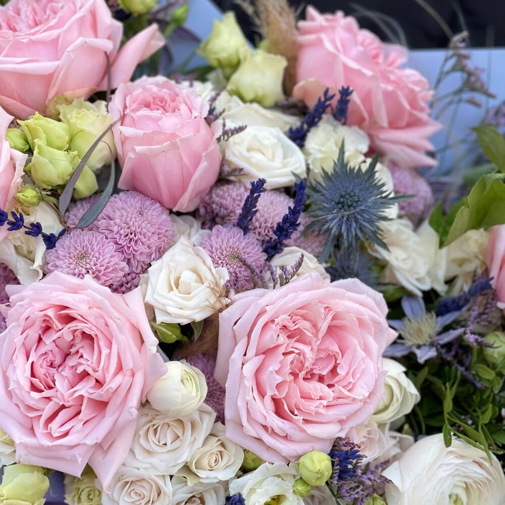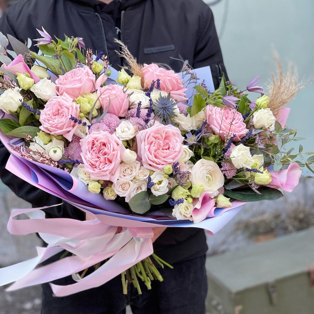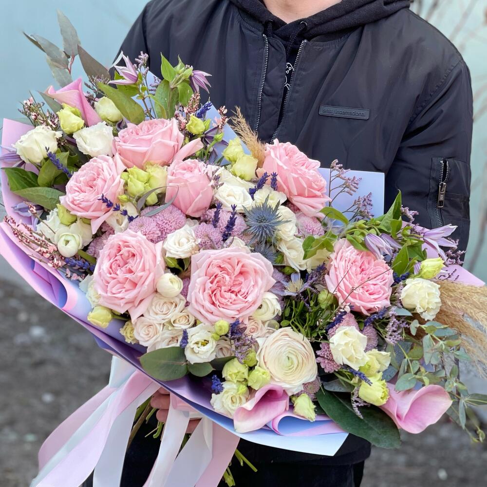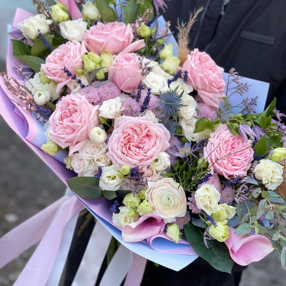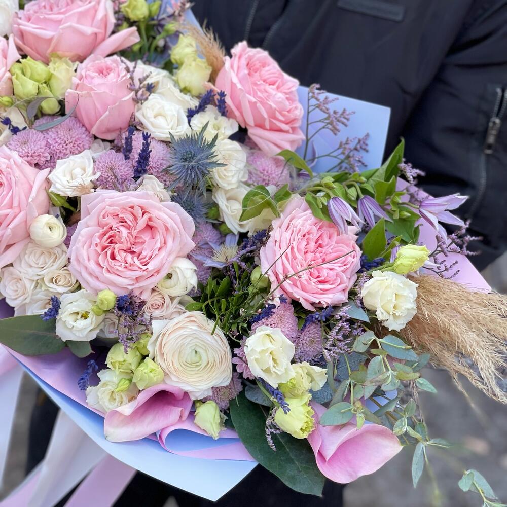 роза пионовидная «принцесса хитоми» – 7 шт.Роза кустовая – 5 шт.Эрингиум – 2 шт.Лимониум – 3 шт.эустома махровая – 5 шт.Клематис – 2 шт.Калла – 3 шт.Ваксфлауэр – 3 шт.картадерия (сухоцвет) – 1 шт.эвкалипт робуста (пучок) – 1 шт.Эвкалипт цинерея – 2 шт.писташ пучок – 1 шт.Подарочная упаковка – 1 шт.Лента атласная – 2 шт.