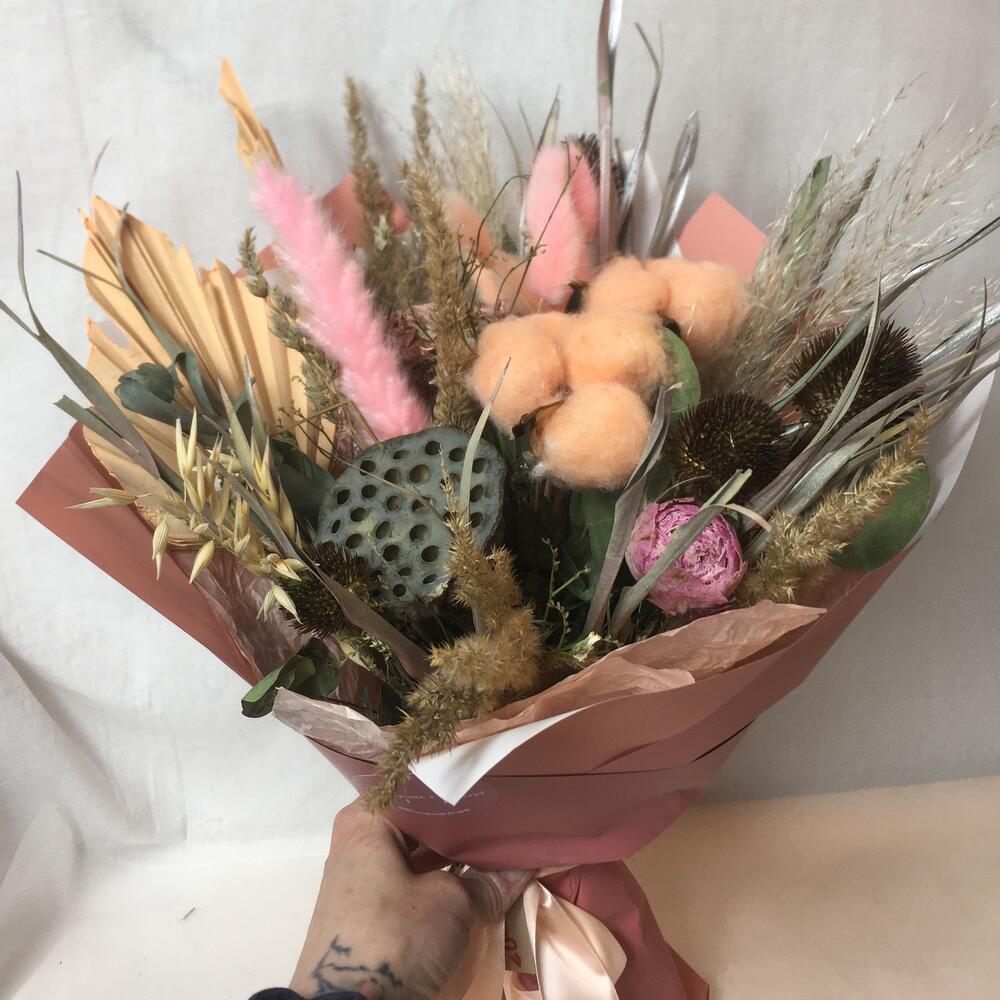 Эвкалипт – 5 шт.Роза сухоцвет – 2 шт.Лотос сухой – 1 шт.Лагурус (сухоцвет) – 7 шт.Хлопок (сухоцвет) – 2 шт.сухоцветы микс – 7 шт.пион сухоцвет – 1 шт.пальмовый лист – 2 шт.