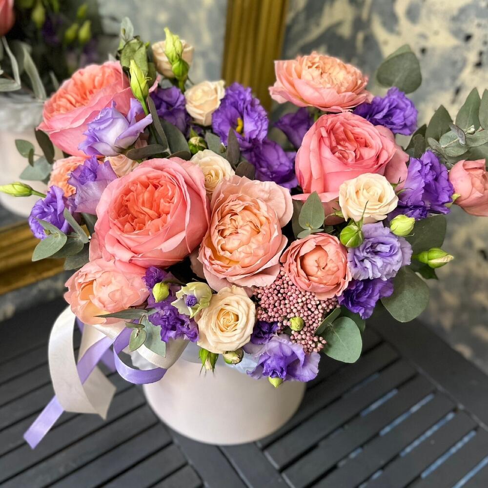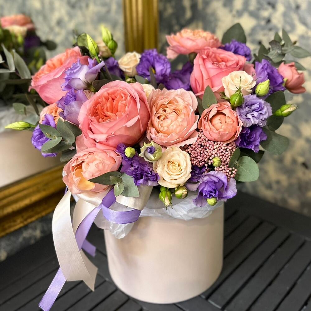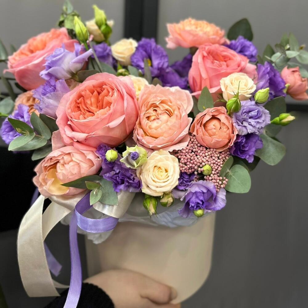 роза пионовидная пинк экспрешн – 3 шт.роза кустовая таня – 1 шт.роза пионовидная кустовая джульетта – 1 шт.эустома лавандовая – 3 шт.Озотамнус – 1 шт.Эвкалипт – 3 шт.Тишью – 1 шт.Оазис флористический – 1 шт.Коробка шляпная – 1 шт.Лента атласная – 2 шт.