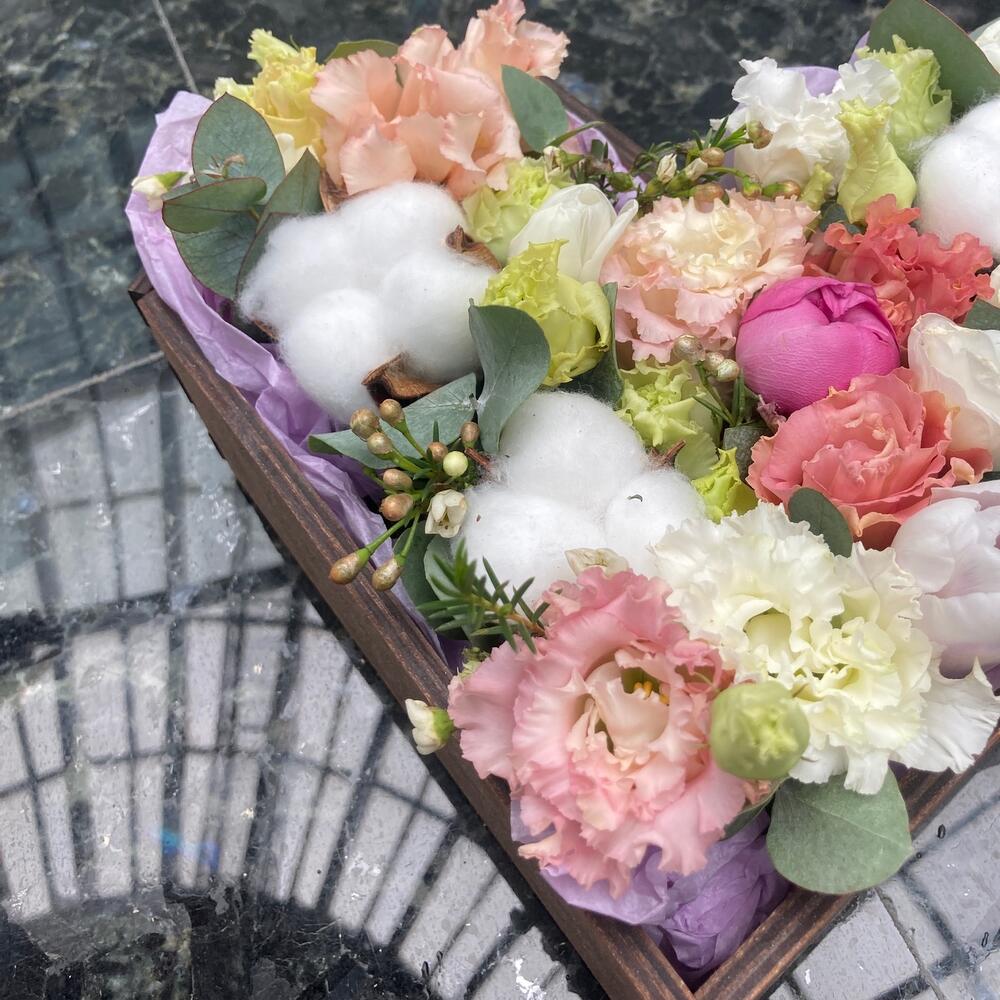 Роза кустовая пионовидная – 1 шт.Лизиантус – 2 шт.Тюльпан – 1 шт.Хлопок – 3 шт.Ваксфлауэр – 1 шт.Эвкалипт – 1 шт.ящик сердце деревянный – 1 шт.