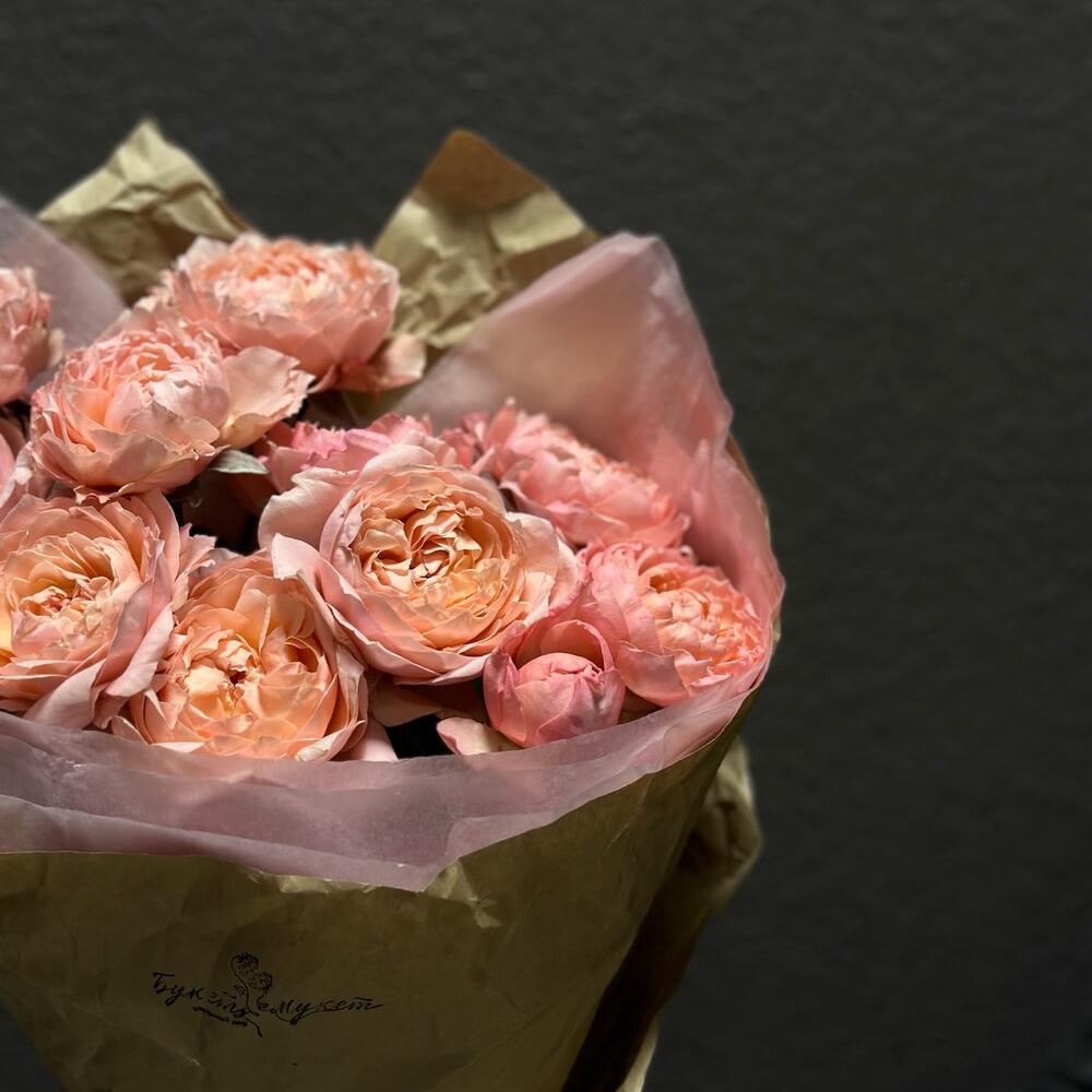Лента атласная – 1 шт.Тишью – 2 шт.Крафт – 1 шт.Роза пионовидная Джульетта – 3 шт.