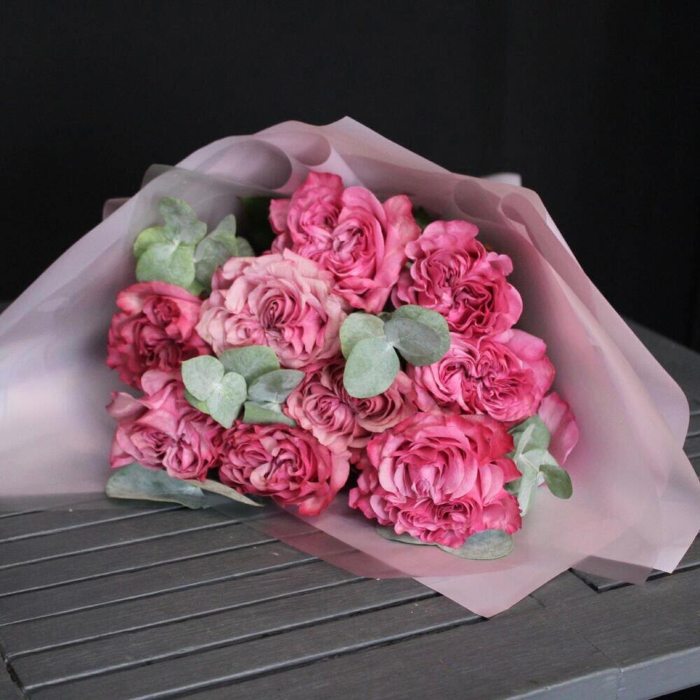 Эвкалипт – 3 шт.Лента атласная – 2 шт.Пленка матовая – 4 шт.роза пионовидная кантри блю – 9 шт.