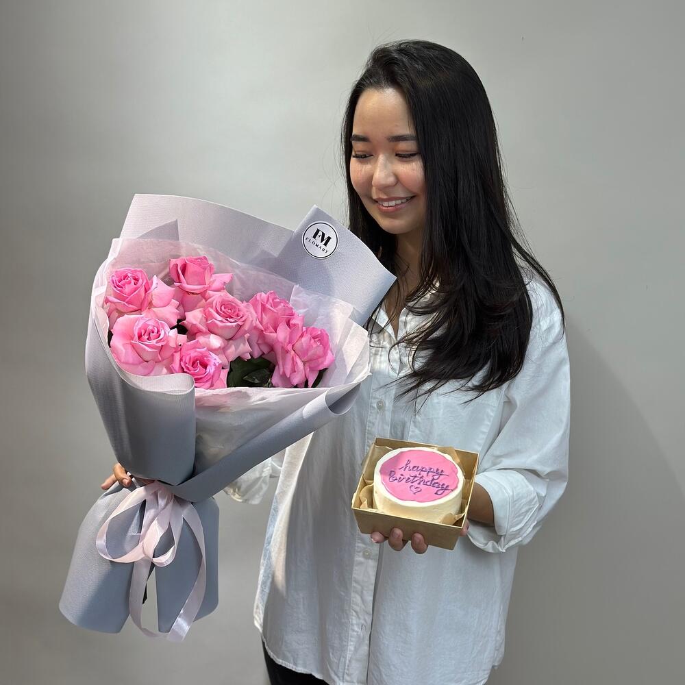 7 французских, раскрытых роз в оформлении + бенто торт.