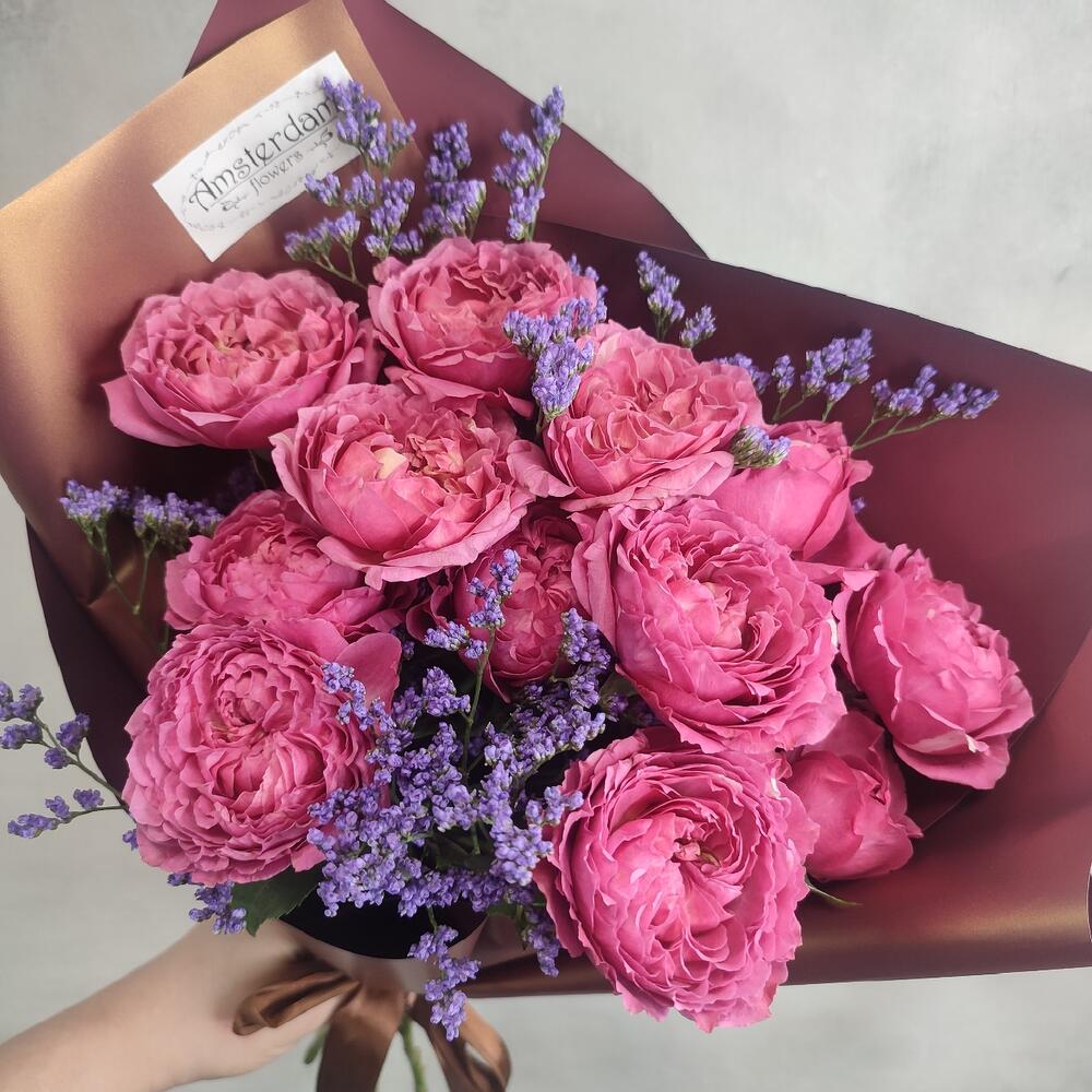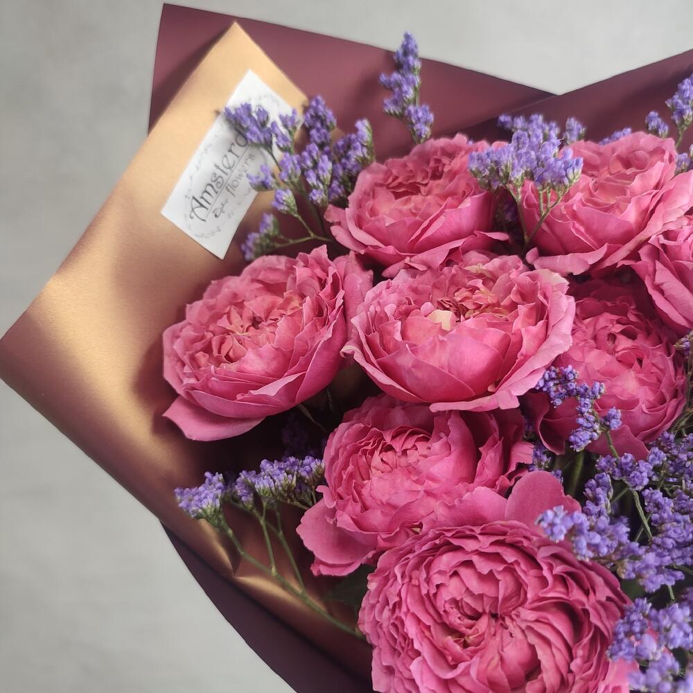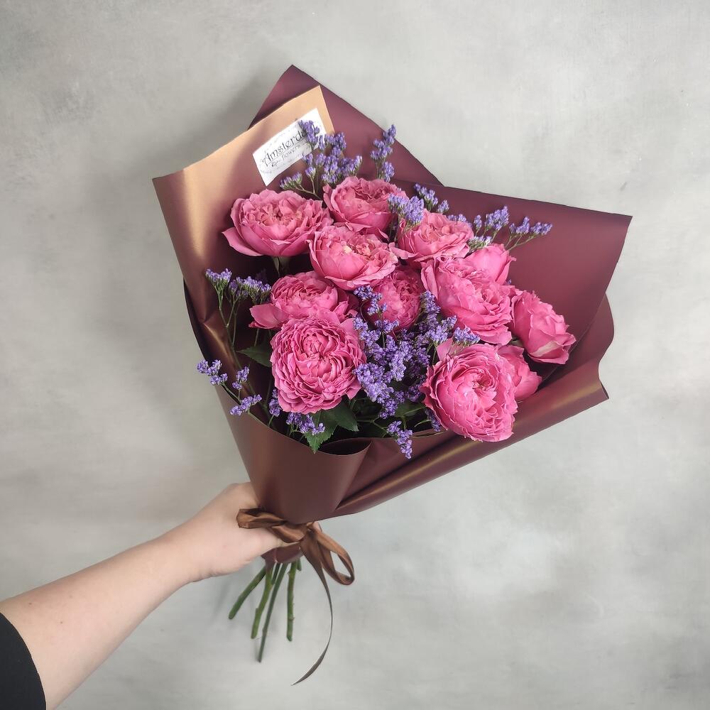 Лимониум – 2 шт.Упаковка – 1 шт.Роза пионовидная кустовая – 3 шт.