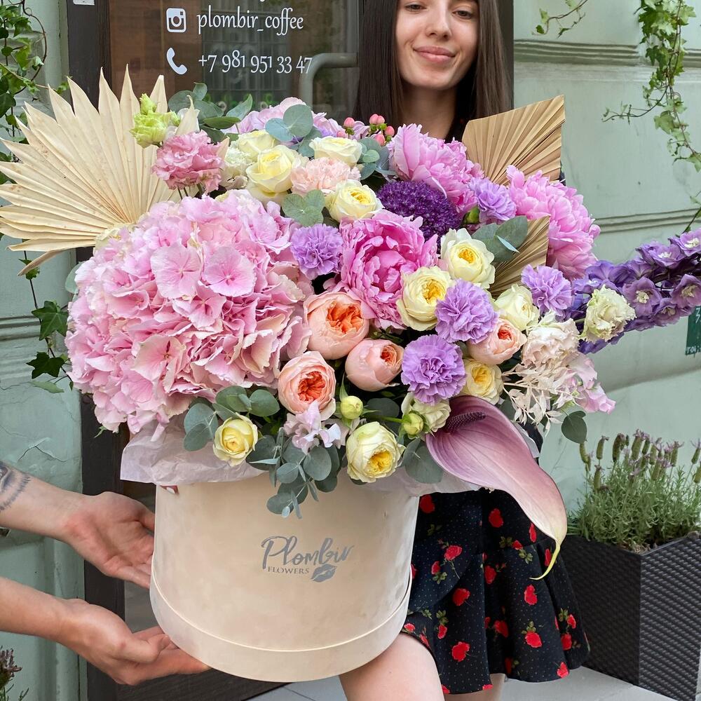 Гортензия – 1 шт.Коробка шляпная – 1 шт.Оазис флористический – 2 шт.Пион – 3 шт.Роза – 5 шт.Роза кустовая – 5 шт.Эустома – 5 шт.Зелень – 5 шт.Сухоцветы – 5 шт.