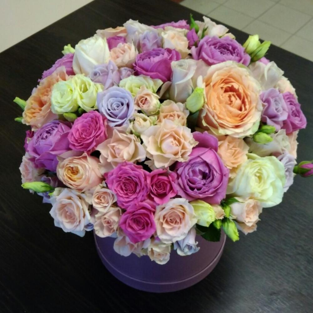 Роза пионовидная – 9 шт.Роза кустовая пионовидная – 5 шт.Роза кустовая кремовая 50 см – 10 шт.Роза кустовая сиреневая – 7 шт.Роза Мента – 7 шт.Роза кустовая розовая 50 см – 7 шт.Лизиантус – 7 шт.Роза сиреневая – 5 шт.Коробка шляпная – 1 шт.