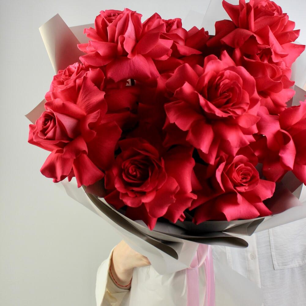 Монобукет из ярко-розовых вывернутых роз в дизайнерской упаковке