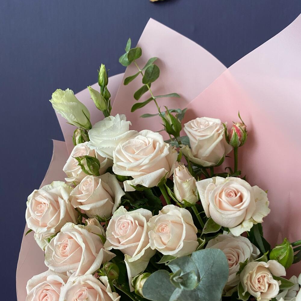 Роза кустовая – 5 шт.Лизиантус – 4 шт.Эвкалипт – 3 шт.Матовая пленка – 4 шт.Лента атласная – 1 шт.