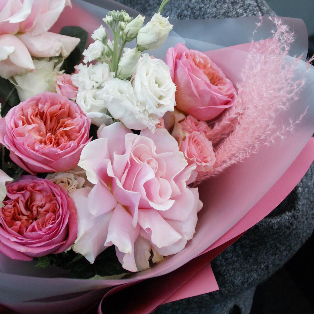 Маттиола – 2 шт.Кустовая роза – 4 шт.Эустома – 1 шт.Пионовидная роза – 3 шт.Атласная лента – 2 шт.Французская роза – 3 шт.Матовая пленка – 4 шт.мискантус – 2 шт.