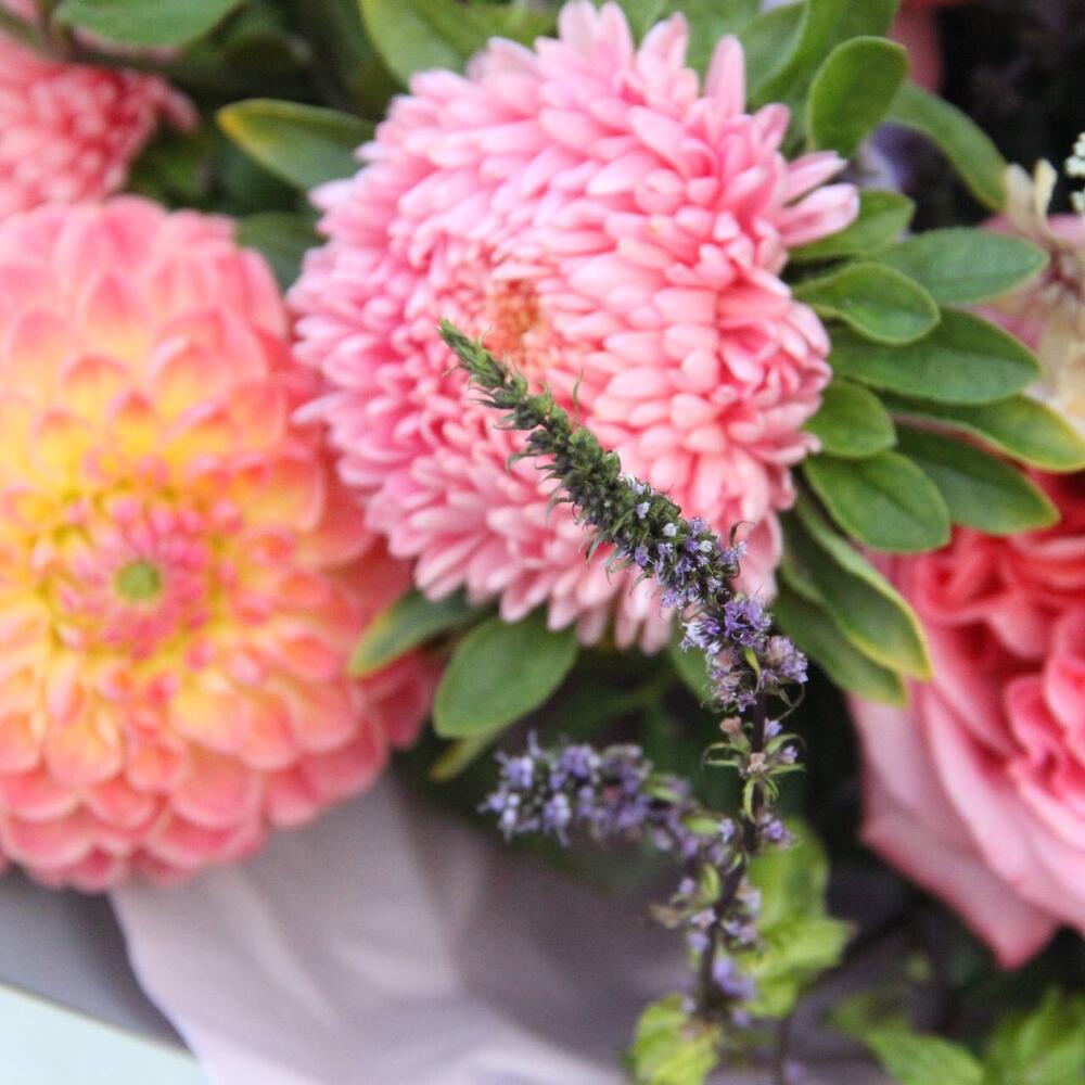 Эрингиум – 1 шт.книффония – 2 шт.Роза пионовидная – 2 шт.Астра – 3 шт.Клематис – 1 шт.Мята – 2 шт.эвкалипт стабилизируемый – 2 шт.Эвкалипт – 3 шт.Фисташка – 3 шт.Упаковка – 1 шт.
